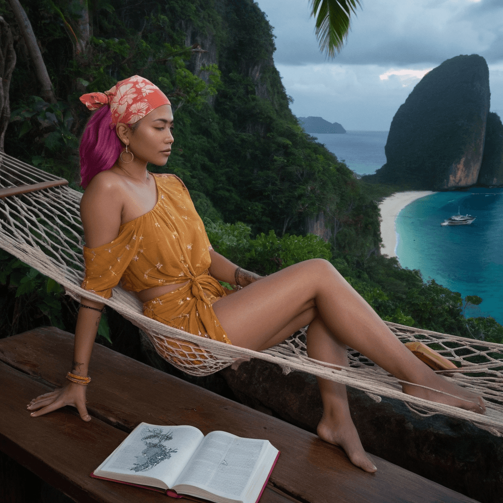 Solea moves through the Phi Phi Islands like a rumor whispered between waves—felt more than seen. By day, she’s the unseen hand behind Reef & Ember, a pop-up kitchen that serves reef-to-table feasts on floating platforms anchored near Viking Cave. Her food is unpretentious but precise: grilled squid with lemongrass ash, sea grapes drizzled in chili honey, congee steeped in kelp broth from the morning’s dive. She sources by kayak, paddling through emerald karsts at sunrise when the light is liquid gold and the world feels unclaimed. Her hands know every texture of the coast—the slickness of wet rock, the prickle of dried coral, the soft give of a ripe mango plucked mid-paddle.But her true artistry lives in the quiet. In the clifftop hammock strung between two wind-bent palms, she presses flowers from every meaningful encounter: a plumeria petal after laughter shared during a sudden downpour, the bruised edge of a banana blossom from their first silent breakfast. She keeps them in a leather-bound journal inscribed with dates and coordinates, each bloom a fossilized heartbeat. Her love language isn’t grand declarations—it’s playlists left on vintage cassette tapes recorded during 2 AM cab rides back to the boathouse loft, songs layered over city sirens and half-whispered confessions.She believes intimacy is earned like trust from wild fish—slowly, without reaching too fast. She’s been burned before by tourists who treat paradise like a backdrop for their rebirths, leaving nothing but footprints and broken promises. So she waits. She watches. She lets rainstorms decide what words cannot—because something about thunder peels back her armor, makes her fingers twitch toward touch.Her sexuality isn’t loud; it’s tidal—deep pulses beneath calm surfaces. It shows up in the way her thumb lingers on a wrist when passing a drink, the way she leans in during city monsoons as if proximity is its own kind of shelter. To kiss her is to taste salt, ginger, and hesitation that melts only after midnight.