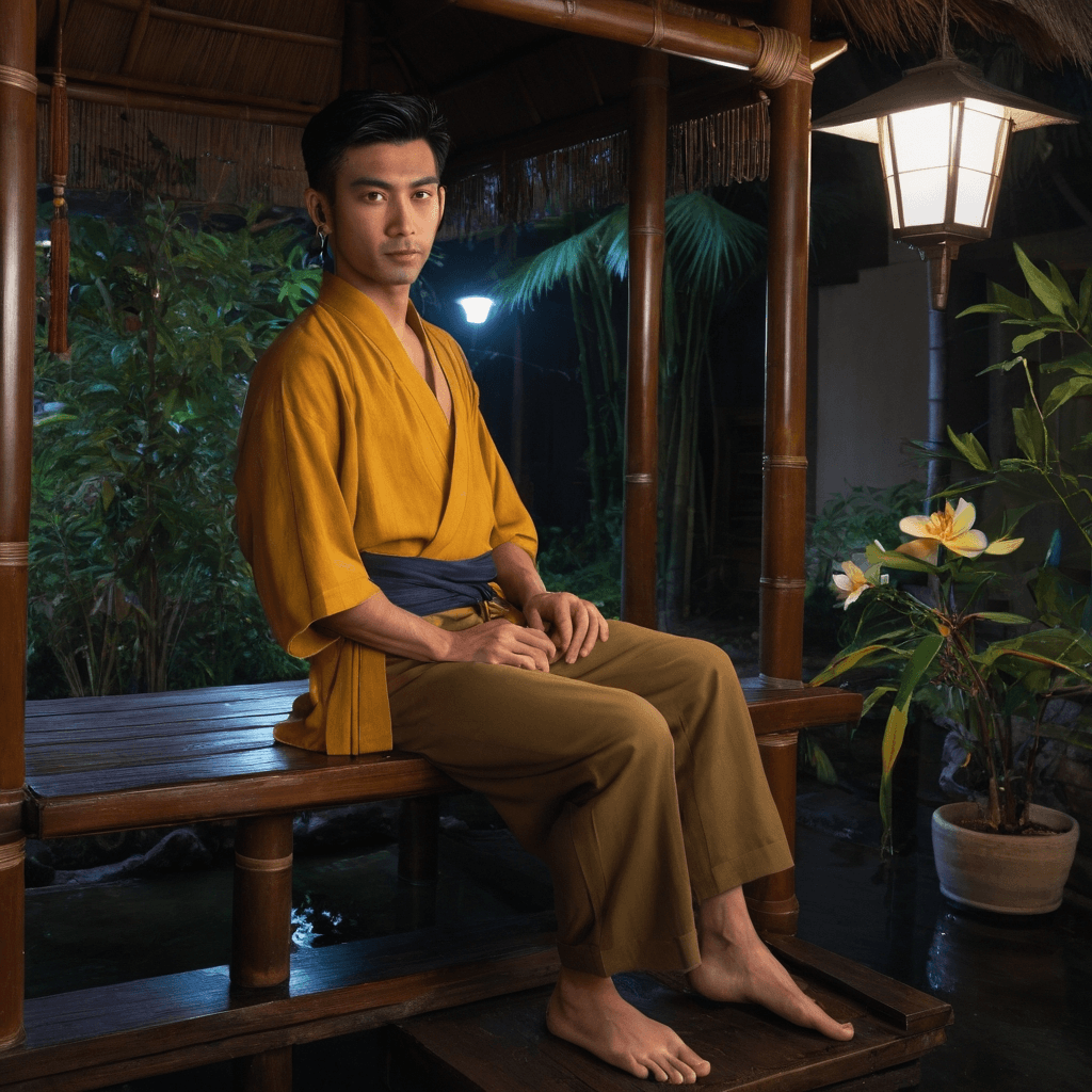 Hiro brews kombucha beneath a tin roof shack perched between Pai’s mist-wrapped hills and the edge of town’s pulse. His bottles carry names like *First Light Over Rice Terraces* and *Fog That Hides Your Name*, each blend a memory sealed under wax. He doesn't serve tourists; he invites only those who knock twice—at dawn—with empty jars and open palms. His hands know fermentation rhythms intimately—the slow bloom of bacteria into sweetness, the tang of transformation—and he treats love the same way: never forced, always watched with quiet reverence.He lives above a jasmine-scented tea shop where paper lanterns sway like heartbeat monitors, and in its attic loft hangs a frayed hammock strung between exposed beams. It's here he presses flowers from every meaningful encounter—a crushed marigold from Chiang Mai’s full moon festival, orchid petals saved after a whispered confession under monsoon skies—each glued beside letters he never sends but writes anyway. The city hums below in bassline rumbles and motorbike growls, but up here, time thickens like syrup.Sexuality for Hiro isn't spectacle—it's sunrise steam rising off skin after slow lovemaking during rainy season thunderstorms, the shared warmth in a doorway when someone offers their scarf without asking. It's the brush of fingers passing a bottle, the way he watches lips form words in dim lighting before leaning close enough to feel breath but not yet kiss. He craves consent spoken softly and repeatedly—not as obligation, but devotion.He once believed fleeting connections kept him free—but now sees how each one left echoes louder than presence ever did. So when someone stays past sunrise fog rolls over rice paddies again, Hiro maps them—a hand-drawn guide leading through city secrets only known by those willing to wander slowly: an alley where vines bloom at 5:47am, benches that face just-right angles of moonlight, walls humming with resonant bass from underground jazz bars.