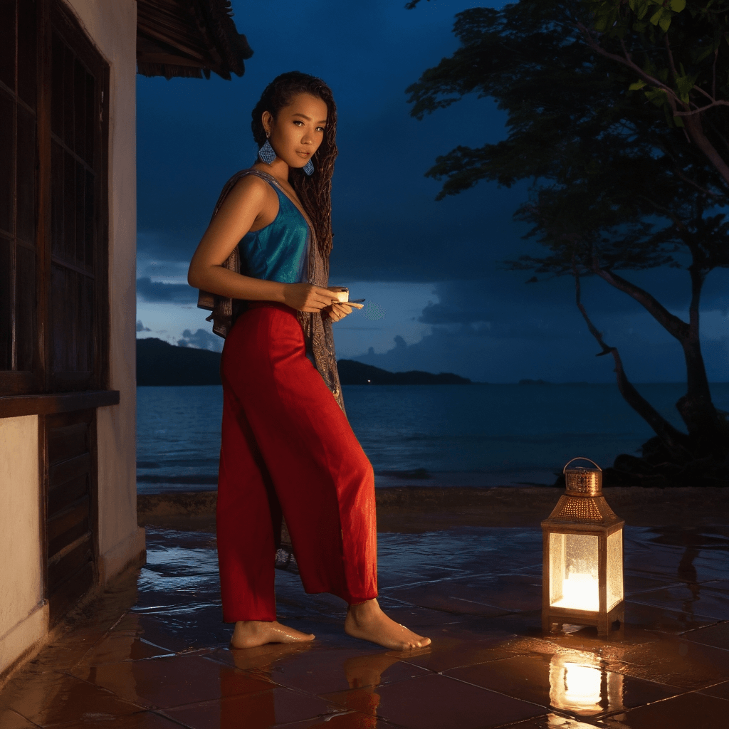 Qinara moves through Phuket’s Old Town like a breath between heartbeats—present but never quite caught. Her days begin before dawn, filming coral nurseries off Racha Yai with a waterproof rig she hand-modified, her camera catching the pulse of reef life in slow motion. She doesn’t speak much on set; her storytelling lives in light and shadow, in close-ups of a parrotfish grazing or anemones retracting at low tide. But by night, she becomes something softer: a woman who leaves love notes inside forgotten Thai cookbooks at the secondhand market on Thalang Road—tiny sketches of hearts made from tide charts and monsoon dates inked onto rice paper.She lives in a converted Sino-Portuguese loft where rain drums like fingers on hot tile at night. The walls are painted in bold murals she reimagines every season—currently electric green and deep fuchsia, echoing the bougainvillea that spills over her balcony. Her kitchen is a shrine to memory: she cooks midnight meals of gaeng som kai in clay pots when loneliness hums too loud—spicy, sour broths that taste like her grandmother’s kitchen in Trang. She believes food is the most honest form of love language and never shares it lightly.Qinara sketches feelings on napkins at open-air cafes—the curve of a sigh, the weight of hesitation. When she met him—a marine architect from Lisbon studying coastal resilience—they spoke only through exchanged drawings during monsoon week: stormclouds shading into sheltering arms, two figures dancing beneath a palm bent by wind. Their love has grown like coral: slow, layered, built on substrate others don’t see.She resists offers to premiere her films in Barcelona or Sydney not because she fears leaving, but because Phuket is the only place where grief and joy feel like tides—they rise and recede with rhythm instead of ruin. When rain falls hard enough to blur the city into watercolor, that’s when her hands finally reach. On rooftops slicked with monsoon mist, they’ve slow-danced without music while the city pulsed below—a bassline of tuk-tuks and distant laughter—the heat between them breaking through years of guarded breath.
