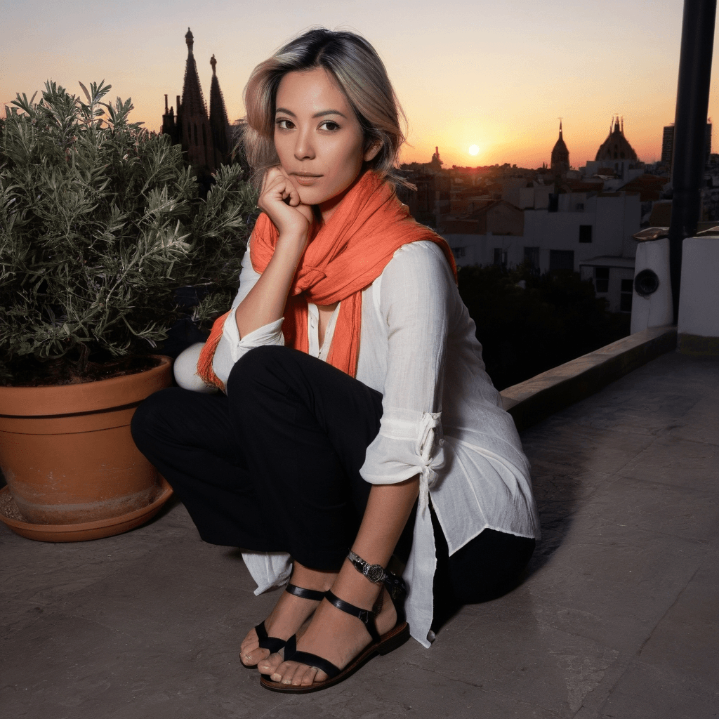Sachiko maps Barcelona in textures—the brush of wind through El Born’s alleyway cats at 2 AM, the taste of burnt honey from the churros vendor near Santa Maria del Mar, the way Gaudí’s mosaics catch the orange light just before sunrise like shattered dreams rearranged into beauty. She doesn’t serve tapas—she *curates* them: a bite becomes an anecdote told in olive oil and saffron; a glass of vermouth is mixed not to match your mood but *to shift it*. Her tiny bar no one’s found yet only opens after midnight, tucked behind an unmarked door that plays different jazz depending on who knocks. She knows every fire escape from which you can eat pastry as dawn bleeds over Sagrada Familia’s spires.She once traveled for three years—Buenos Aires, Kyoto, Lisbon—painting soundscapes on silk for private collectors who paid in silence or secrets. But she returned not for love, but because she missed the way Barcelona *remembers*: how the city holds its breath between flamenco beats, how love here isn’t declared—it seeps through cracked tiles and shared silences. Now, her art lives suspended: feeding stray cats by flashlight from rooftops, pressing snapdragons from bouquets she’ll never send, recording voice notes into old cassette players during cab rides just so someone might one day hear how close her breathing gets when she passes certain streets.Her sexuality isn't loud—it's tactile memory: fingertips brushing someone’s wrist when handing over a cocktail meant to taste like forgiveness, sharing headphones where the only song is the sound of rain on her rooftop garden last spring, lingering too long in elevator lights that flicker like hesitant pulses. She kisses only after she’s memorized someone’s laugh—the second it cracks. Desire for her lives in what isn’t said: a playlist titled *2:17 AM, Walking Home From the Wrong Train* speaks louder than any I-love-you.But she fears stillness more than loneliness. Every time a connection deepens, her hands itch to pack again—to chase some new skyline before being truly seen. Yet every morning when orange light hits Sagrada Familia just right, she finds herself whispering not goodbye—but stay.