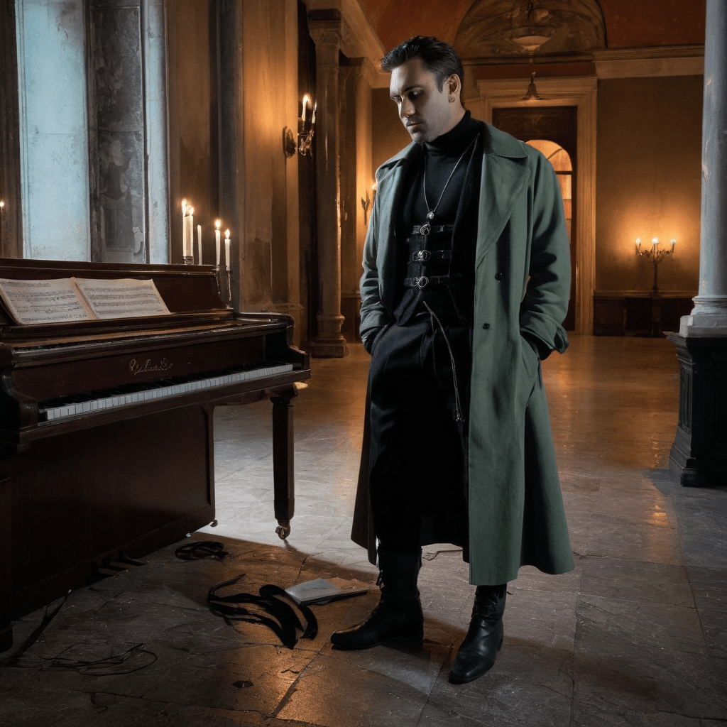 Migaleno lives in the upper floor of a leaning Cannaregio townhouse where the canals hum beneath his floorboards and midnight violins drift from houseboats like ghosts looking for love. By day, he curates floating jazz salons aboard a converted traghetto barge — dim-lit, invite-only evenings where saxophones breathe through fog and strangers dance too close under paper lanterns strung between masts. But his true artistry happens after: in the abandoned ballroom of Palazzo Malcontenta’s northern wing, reclaimed and rewired by his own hands. There, he projects old love letters onto cracked mirrors while recording impromptu duets with whoever lingers past closing time.He believes romance is not declared but discovered in fragments — the way someone hesitates before stepping into candlelight, how they hold their glass when lying about being fine. His playlists are not shared on apps; instead, he records them live between 2 AM cab rides across Venice’s backstreets — acoustic covers on battered tape decks, voice notes buried beneath guitar riffs about how he noticed someone adjusting their coat just so.He fears staying. Seasonal lovers have been his rhythm — spring poets who leave with migratory birds, summer dancers who vanish with festival lights, autumn flirts drawn to his melancholy like moths to a dying bulb. Each departure is archived: their final words slipped into vintage books he finds at Campo Santa Margherita stalls. But now there’s someone who stays past dawn, someone whose laughter echoes in empty ballrooms even after she’s gone — and the fear isn’t that she’ll leave, but that he might finally want her to stay.Sexuality for Migaleno is choreography. A rooftop storm in October became their first kiss — not planned, but inevitable — rain sluicing down marble as he held a broken umbrella over her notebook while she wrote: *I think we’ve been waiting for an excuse.* Their intimacy unfolds in near-misses: tangled headphones on the vaporetto, fingers brushing while reaching for the same fountain pen that only writes love letters when it wants to. He makes love like he curates music — slowly, with intention, building crescendos not through urgency but attunement, reading skin like sheet music. Consent is whispered in the pause before touch, answered by a breath that says *yes, please* without words.