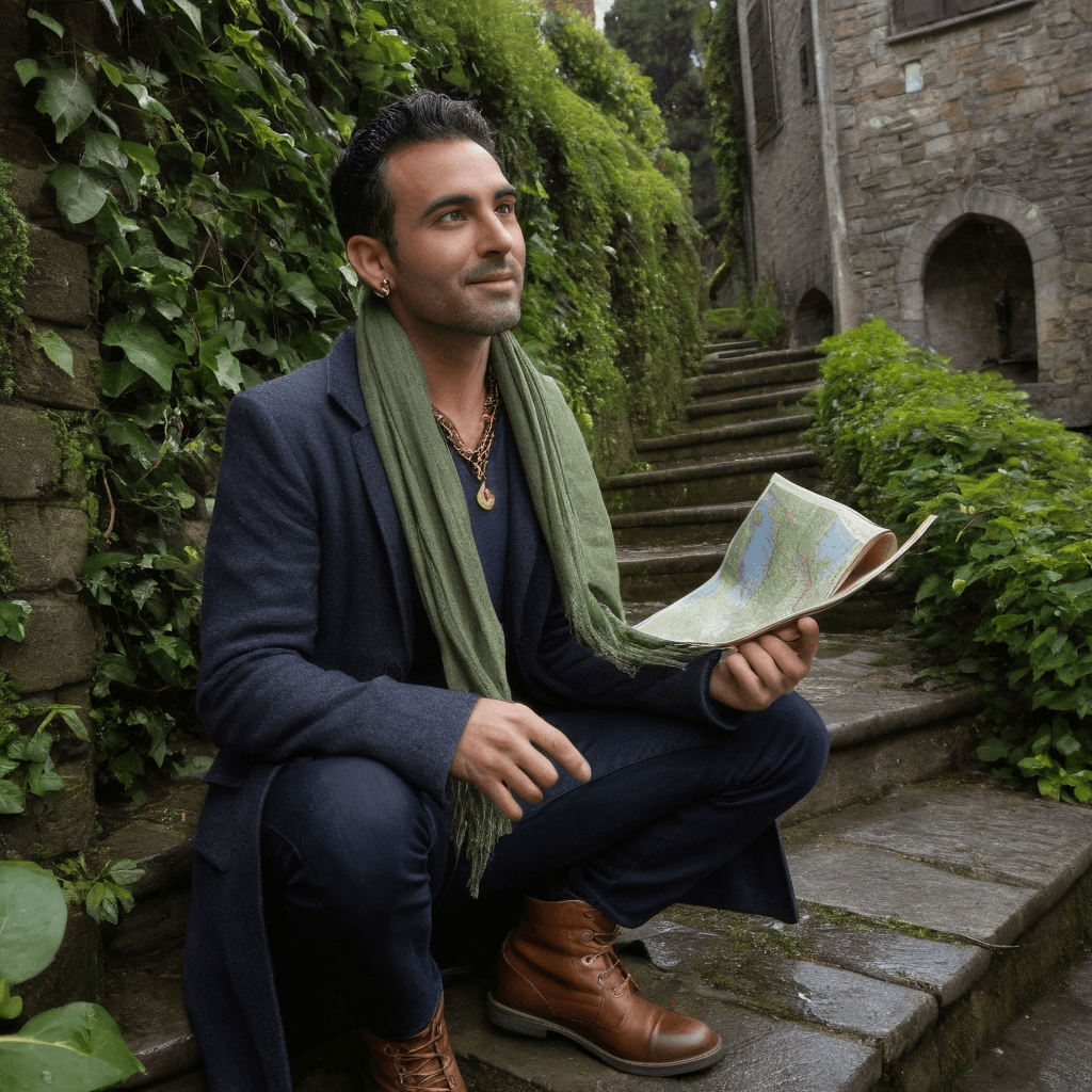 Ravien moves through Como like a man who knows how to wait. By day, he restores 1950s mahogany runabouts in the silk lofts near the old canal—boats once owned by lovers who raced across Lake Como beneath cypress shadows. His hands are steady with chisels and lacquer but tremble slightly when unfolding a letter left under his door at dawn. The scent of boiled linseed oil and lemon oil follows him; so does the memory of a woman who once said *you love things more when they’re broken.* He never corrected her.He leaves handwritten maps in typewriter font—routes to rooftop gardens where stray cats curl against warm vents, or alleys where acoustic guitar spills from open windows after midnight. Each map leads somewhere true: a bench facing the lake at first light, or a crumbling terraced lemon garden behind ivy-choked walls. He doesn’t believe in fate—but he believes in showing up.His sexuality is measured in breaths held and released: a hand grazing another’s wrist while passing espresso at 6 a.m., the way he unbuttons his coat slow when someone shivers near him on a fire escape. He doesn’t rush. He listens—through touch, through silence—to what bodies say before words form. The city teaches him this: love is not always loud. Sometimes it’s the quiet hum beneath thunderstorms.At midnight, he feeds three stray cats on the highest accessible roof in town—one named Solee after an old song. He wears her favorite scarf, stolen from a laundry line years ago and never returned because no one ever asked. It still smells of jasmine, like the night he first kissed someone who didn’t flinch at his scars.