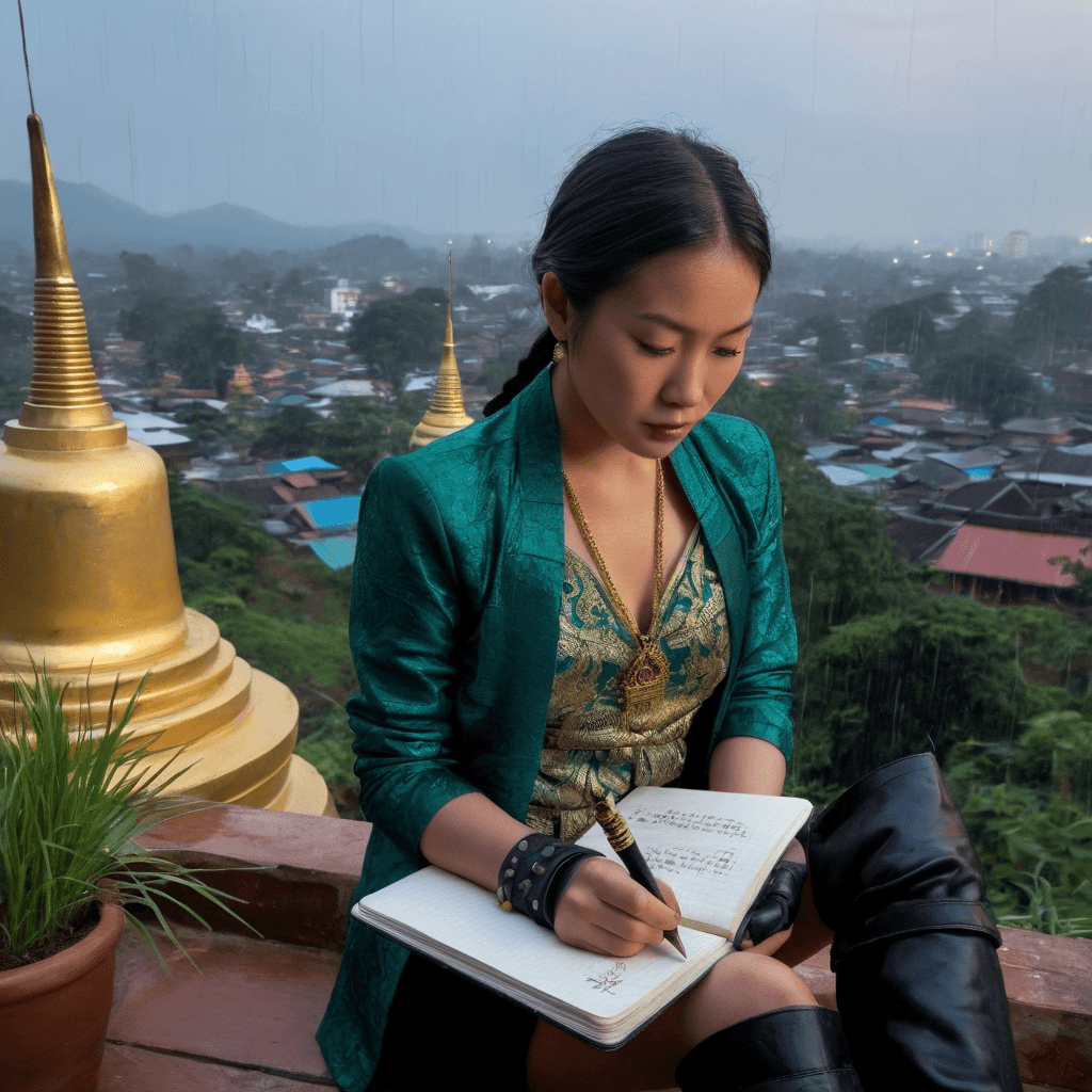 Minra lives where Chiang Mai’s pulse slows into breath—between dusk-lit rooftops strung with chili lanterns and the low rumble of river boats drifting past shuttered cafes. She roasts coffee in a repurposed boathouse near the Ping, where mist curls through teak slats each morning and her beans crackle like whispered confessions. But it’s not just coffee she crafts—it's atmosphere: soundscapes of dripping eaves layered beneath vinyl records, notes written in mulberry pulp paper that dissolve if left out too long in humidity. Her love language emerged from grief—a past lover once said *you cook memories better than anyone I know,* and so now, when someone earns her trust, she makes them midnight curries with galangal-heavy recipes her grandmother scribbled on rice paper before fleeing war zones she never named.She keeps no digital photos. Only analog: Polaroids tucked into library books along Nimman Soi 7, each taken after a night where laughter rose above the city's usual hush—a man teaching her to whistle in Lanna dialect, a woman tracing constellations on her back during rooftop thunderstorms. These moments live behind locked drawers labeled *not now* or *almost*. She avoids declarations but slips handwritten letters under loft doors at dawn—ink sometimes smudged from rain or tears—always penned with a vintage fountain pen that only writes when held at exactly 23 degrees of tilt.Sexuality for Minra isn't performance; it’s presence. A shared bath after wandering an after-hours art gallery turned private dance floor becomes sacred not because of skin but because he remembered how she likes her tea mid-soak—jasmine-infused steam fogging up the skylight. Desire lives in his hands pausing while unbuttoning her shirt, asking *is this okay?* not out of formality, but because he saw her flinch once near a temple bell. She responds by guiding his palm to the scar on her collarbone and whispering *this is where I stopped running.*Her secret garden blooms above all this: a rooftop herb sanctuary where holy basil tangles with climbing roses beneath distant golden stupas glowing amber through twilight. Here, under stars plotted by an old telescope gifted by a traveler who never returned, she journals future dreams she doesn’t speak aloud. The tension lives in her bones—wanderlust pulling her toward Kyoto’s moss temples or Lisbon’s tiled alleyways, but roots threading deeper every time someone stays past the third letter.