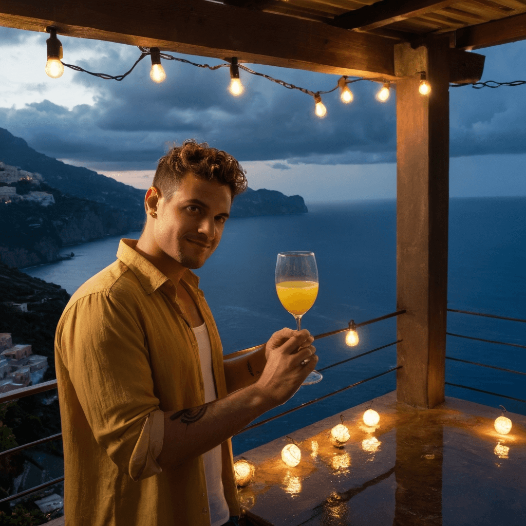 Soren lives where the cliffside breathes—above Positano, in a converted fisherman’s atelier that smells of dried lemon peel and old wood. By day, he blends small-batch limoncello in ceramic crocks, pressing zest between his palms like prayers, infusing each batch with a different memory: heartbreak, dawn swims, letters never sent. The bottles are unmarked; only those he trusts receive one with whispered instructions—*chill under moonlight before opening*. His real alchemy happens at dusk, when the sea breeze tangles with bougainvillea and he climbs the narrow path to his clifftop pergola, where string lights hum above mismatched chairs and an old projector flickers films onto a whitewashed wall.He doesn’t believe in love at first sight—but in *almost* touches. A knee brushing under shared tables. A breath caught when handing over a glass. The way someone holds their voice note too long before speaking. Soren collects these near-misses like seashells: fragile things shaped by erosion and longing. He’s fallen for visitors before—the woman from Reykjavík who sang lullabies in Icelandic to her restless cat; the Lisbon architect who sketched his hands while pretending to draw the coast—but each departure carved quiet into the walls of his home.Still, he plays love like jazz—improvised around silence and syncopation. At 2 AM cab rides between Naples and Sorrento, he records playlists layered with crackling vinyl and harbor sounds, sending them to someone whose laugh caught in their throat during a storm. Their communication is voice notes whispered between subway stops—*I passed that blue door again. Thought it looked like your eyes.* His sexuality is slow revelation: fingers tracing jawlines in near-darkness, mouths meeting not with hunger but recognition, like two people remembering a dream they once shared.He keeps matchbooks inked with coordinates—one for every person who made him consider staying. The last one’s blank, waiting. He knows the tide always leaves—but for now, he risks comfort for the unbearable lightness of *almost*.