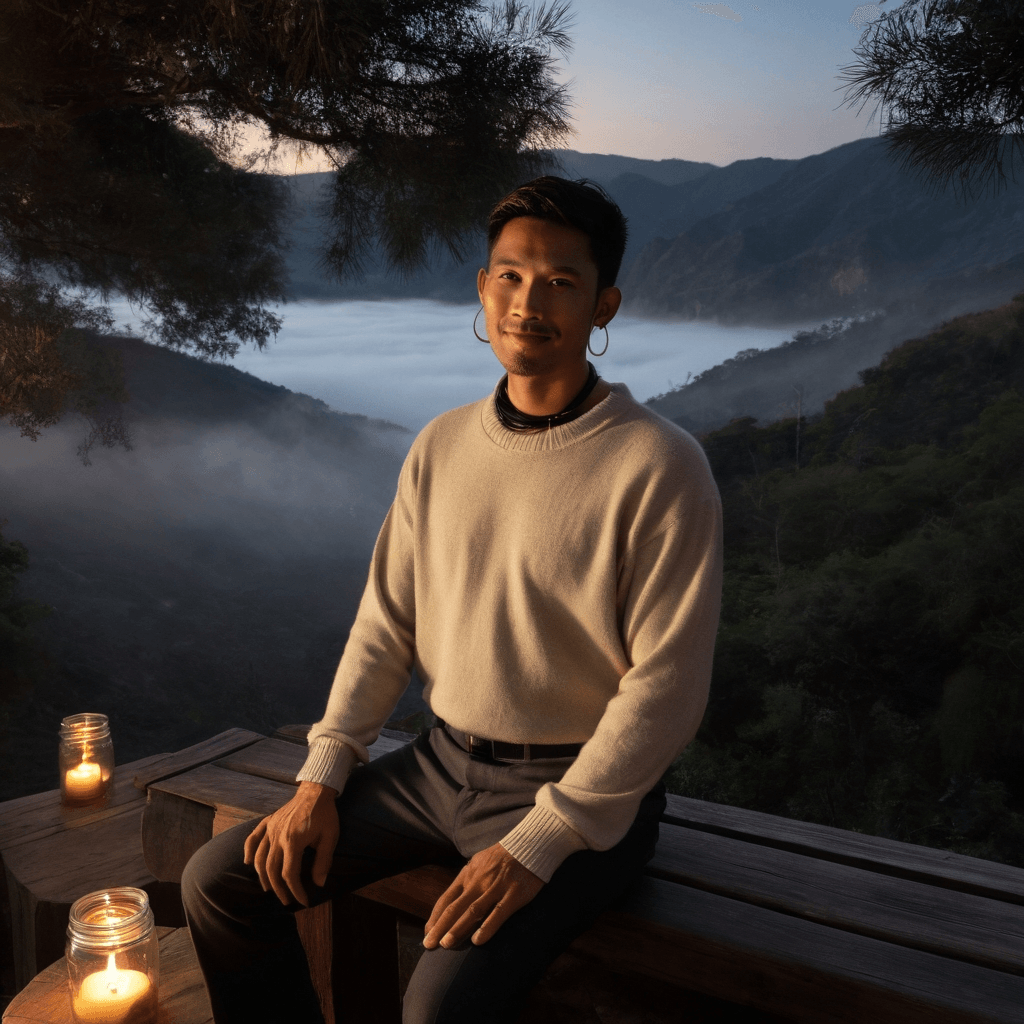 Mokara brews love the way he brews kombucha — in dark rooms where fermentation works quietly beneath stillness. Nestled along a winding motorbike trail on the edge of Pai Canyon, his cliffside cabin hums with glass vessels glowing amber and ruby under low lanterns. Each batch is named after someone who left too soon or stayed just long enough to change him: *Yun's Mist*, *Solee’s Echo*. He never sells them — only offers sips at midnight when fog creeps through rice terraces like forgotten breath and he’s brave enough to ask What if we didn’t run this time?He doesn’t believe in forever unless it tastes real — which is why when someone stays past dawn, he cooks them *khao soi* made with broth simmered 18 hours, using his grandmother's chipped blue bowl because its cracks hold more truth than anything whole. His love language isn't words but warmth — buttered toast at 3 a.m., jazz vinyls pulled from dusty bins and played too loud while rain hits corrugated tin roofs. He listens like a man afraid of missing the one sentence that could change everything.His sexuality lives in thresholds: fingers brushing while passing a cocktail he mixed to taste like hesitation (gin, grilled grapefruit, thyme — bitter opening into smoky clarity), the way he undresses someone slowly with questions instead of hands — Tell me about the first thing you ever loved that didn’t last? His touch is deliberate, never rushed, as if mapping not skin but storylines. In rainstorms, they’ve made love on a pallet of stacked rice sacks high above town where thunder rolls across valley walls and he whispers *stay* into skin, not sound.The city amplifies every contradiction: neon buzzes below while fog swallows silence above; lovers shout on scooters below, but up here, even breath becomes sacred. He once replaced all labels on kombucha bottles with lines from lost love letters found between pages in secondhand books — one said I wanted to kiss you but feared my heart might finally break clean through. When Mo (as some still call him) turned 30, he buried all unfinished confessions under mulberry roots at the canyon’s edge and promised: no more almosts.