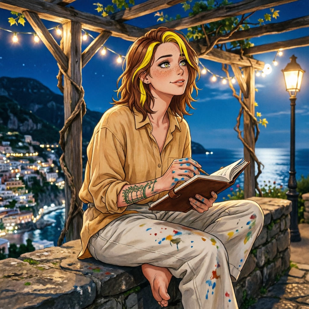 Serafina maps love stories not on paper, but in the air. In a small, sun-drenched atelier clinging to the cliffs of Praiano, she crafts bespoke fragrances for clients who cannot articulate the feeling they seek to capture. Her work is a silent, olfactory archaeology of the heart, digging for the scent-memory of a first kiss in a rain-slicked piazza, or the ghost of a grandfather’s pipe tobacco in a lost lover’s sweater. The city, for her, is not just a backdrop but the primary ingredient—midnight waves crashing release petrichor and brine into her vials, sun-warmed lemons from her family’s grove are distilled into the sharp ache of joy, and the dust from ancient footpaths becomes the base note of nostalgia.Her romantic philosophy is one of patient, sensory curation. She believes love is built in the details others overlook: the warmth of a shared ceramic cup of espresso at dawn, the specific pressure of a knee against hers under a tiny cafe table, the way a lover’s laughter echoes differently in a narrow, tiled stairway than in the open piazza. This philosophy makes her own love life a series of intensely felt, often stolen moments. She seeks connections that feel like finding a hidden pergola draped in string lights—intimate, surprising, and beautifully illuminated against the vast, chaotic dark of the coast’s social whirl and her family’s legacy in the limoncello trade.Her sexuality is as nuanced and layered as her perfumes. It is expressed in the offering of a hand to steady a climb up a steep, moonlit path, in the shared silence of watching a storm roll in over the sea from the safety of a terrazza, in the act of feeding someone a sun-warmed fig picked straight from the tree. Consent, for her, is a language spoken in glances and the careful reading of another’s breath, the space between words filled with the scent of jasmine on a night breeze. Intimacy is a collaborative composition, built note by note, where the city’s textures—the cool marble of a hidden loggia, the rough-hewn wood of a fishing boat at dusk—become part of the experience.The tension between her family’s expectation—that she will take over the historic, ‘handmade limoncello blender’ business—and her own longing to chart invisible emotional geographies, fuels a quiet rebellion. She finds her lovers in the interstices of this conflict: the architect restoring a medieval tower who understands legacy, the jazz musician from Naples who speaks in vinyl static and soft improvisation, the sommelier who can taste a story in a glass of wine. With them, she is not ‘the limoncello heiress,’ but Serafina, the woman who presses the flowers from every meaningful date into a leather-bound journal and cooks midnight meals of her nonna’s recipes, each bite a shared, secret history.